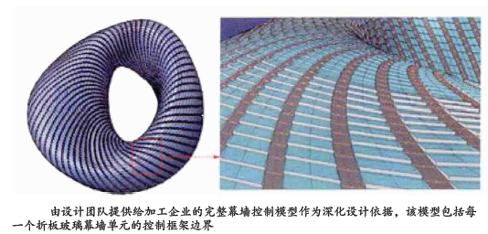 裙房內幕墻初始的控制面由復雜的雙曲面構成。為了能在造價允許范圍內高質量完成設計控制工作,依靠BIM模型的高精準性,設計師們對原始的雙曲面進行了板片優化的數據分析,確定了板片優化的模數設置、板片平面外偏差的消納規則,最終建立起完整的干掛SRC板材幕墻體系模型,用以直接指導后續的生產加工和安裝工作。
