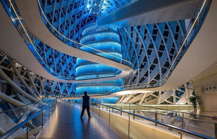 走進這座張拉膜結構建筑,斜向鋼柱形成的韻律在環形坡道映襯下產生了強烈的音樂感。兩柱之間的玻璃幕墻設計成漸變的平板玻璃箱體,插接組合準確,層層疊疊,晶瑩剔透,而在底層入口處的大門洞立面玻璃箱體轉成吊頂。走進其中,周圍的幕墻鋼構弧線順坡而下,向中心匯聚。曲面玻璃和墻板界面的順暢圓滑,板縫的連貫順直,各種設備口部的整合和控制等等都完美地契合在一起。
