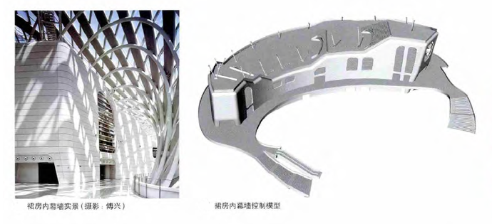 幕墻、結構外殼一體化的設計概念,將張拉膜結構建筑表皮形式、結構和材料構造進行高度的設計整合。它們的界限在創作中實現融合,表皮既是結構,結構也是裝飾,鋼構件、鋁板、幕墻玻璃被技巧性地塑造成一個流暢的張拉膜結構建筑曲面。