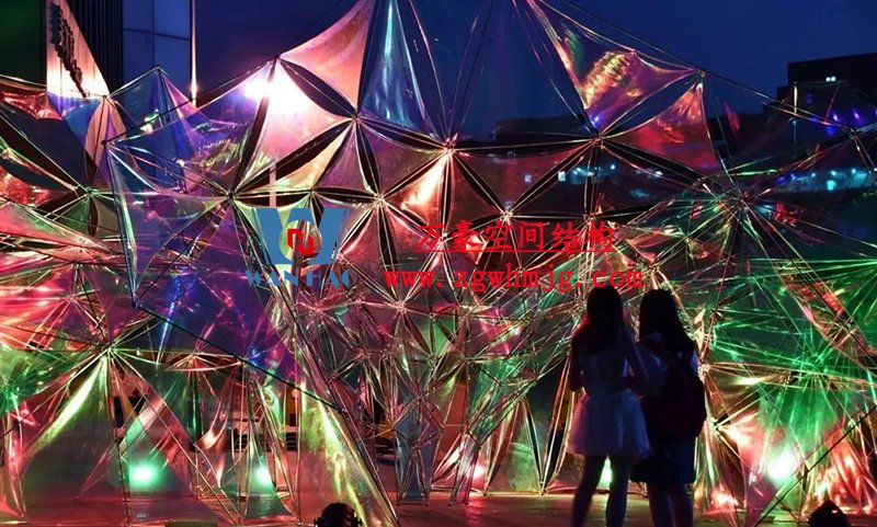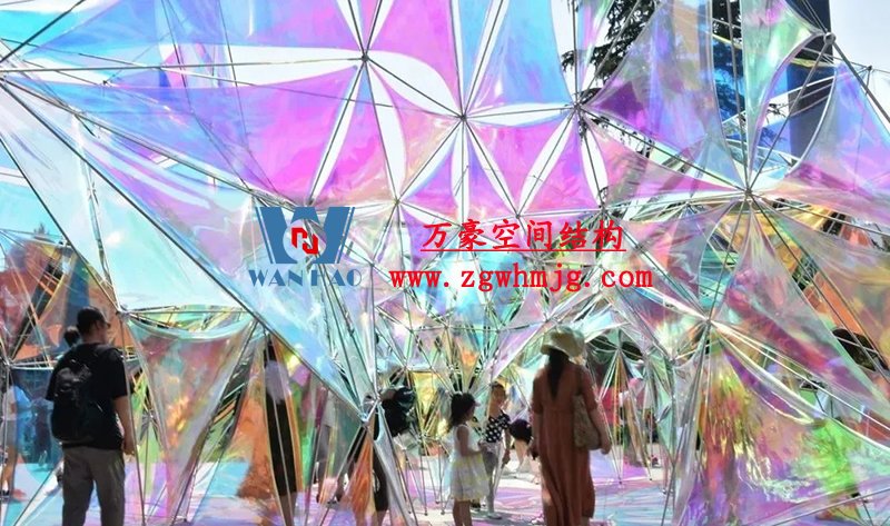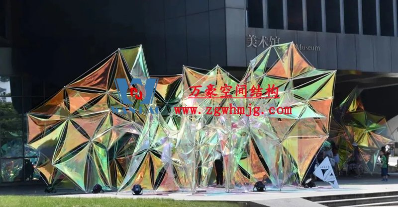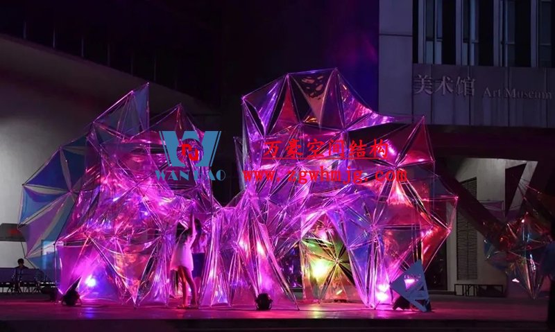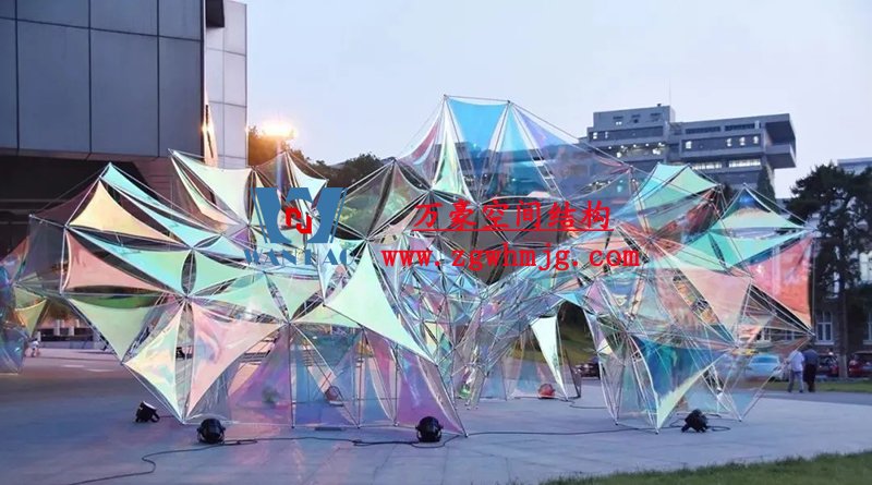 結構體系形成的三角面網格是由計算機通過對異形曲面細分并優化得到,三角嵌面使用半透明PVC膜。