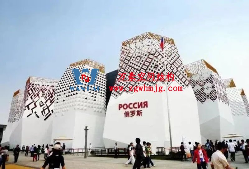 俄羅斯館是4個(gè)保留場(chǎng)館中規(guī)模最大的自建館,由12個(gè)象征著生命之花以及世界之根的白金紅三色塔樓組成,塔樓頂部的鏤空金屬花格各不相同。