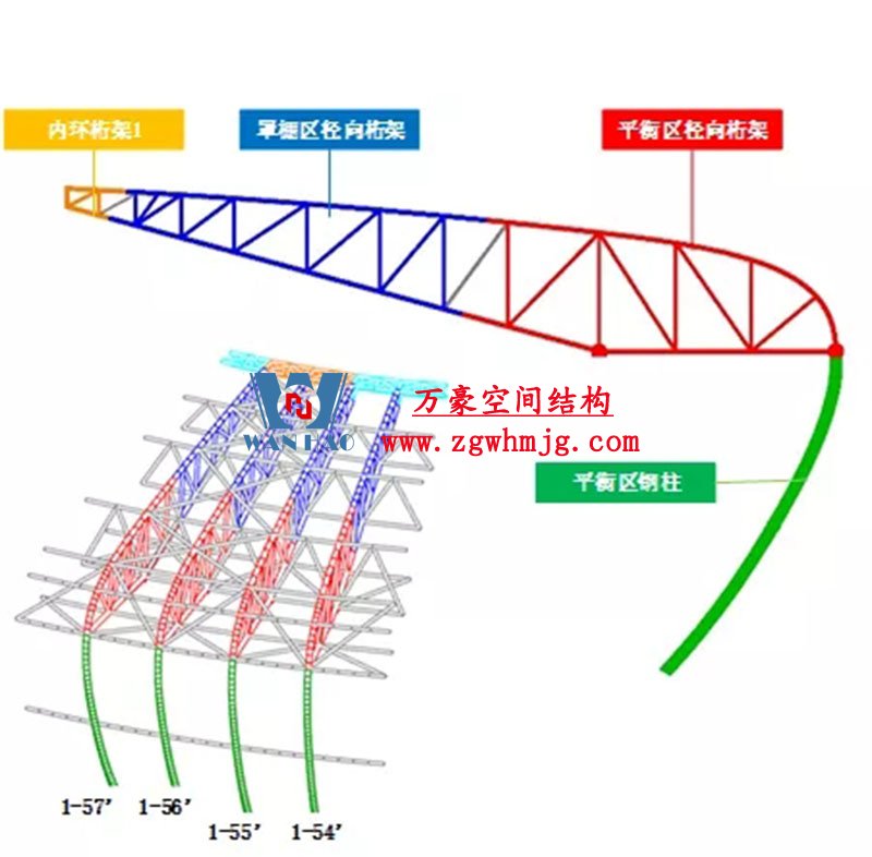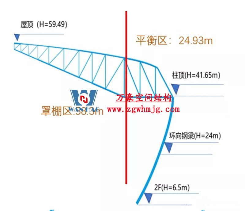 鋼罩棚平衡區長度27m,內部主桁架懸挑長度最大達58m。懸挑部分位于看臺上方,安裝高度高達59.5m。單榀桁架最大單重55t,單根鋼柱重量達60t。
