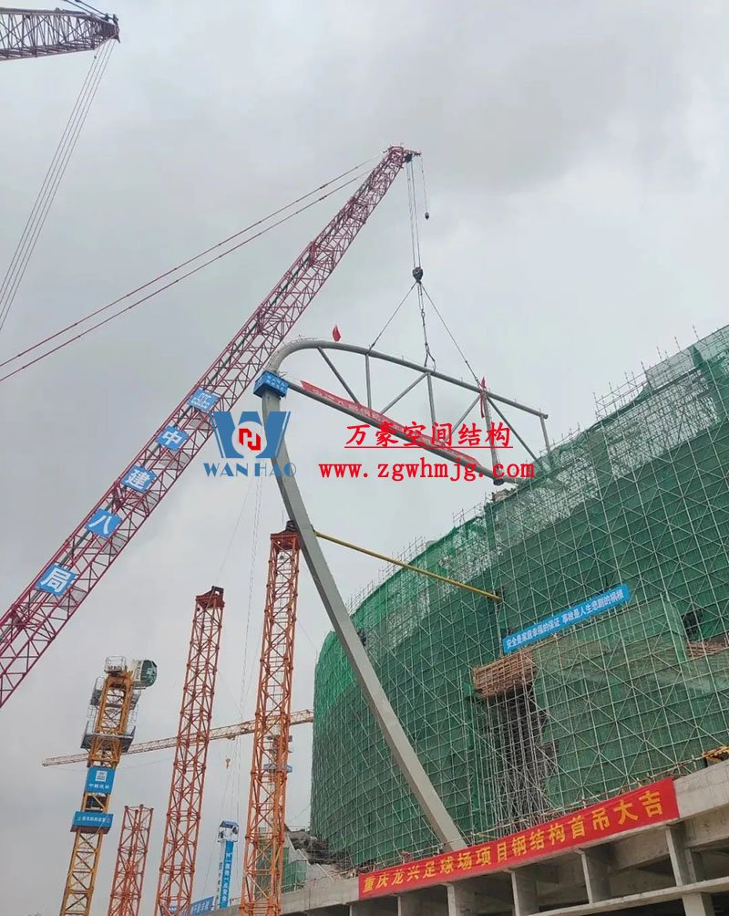 8月18日,隨著最后一榀環向桁架吊裝完成,重達14000噸的罩棚鋼結構順利封頂,重慶龍興足球場項目鋼結構全部完成,創2023年亞洲杯新建場館建設速度第一。這是重慶市打造的首座大型專業足球場,也是國內在建的規模最大專業足球場之一,其設計取意為“火鳳凰”。