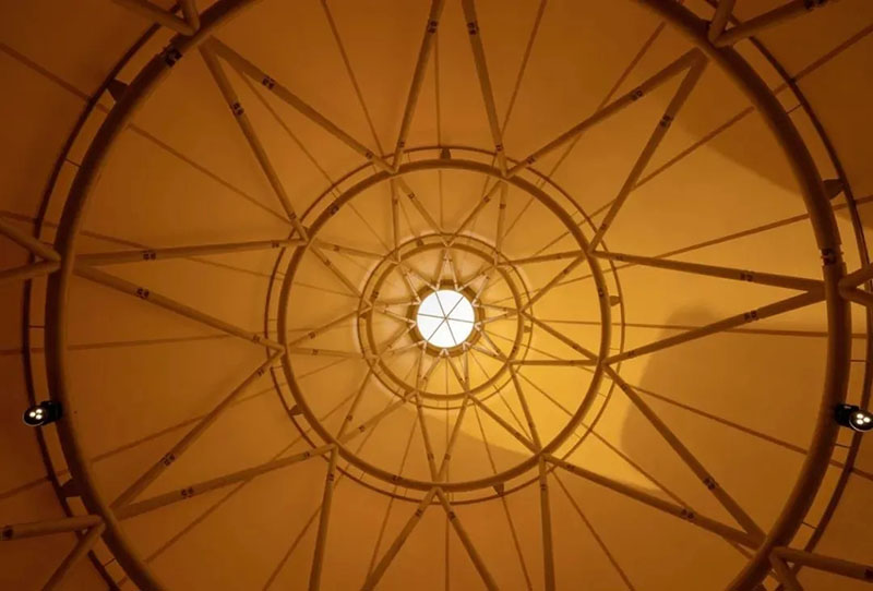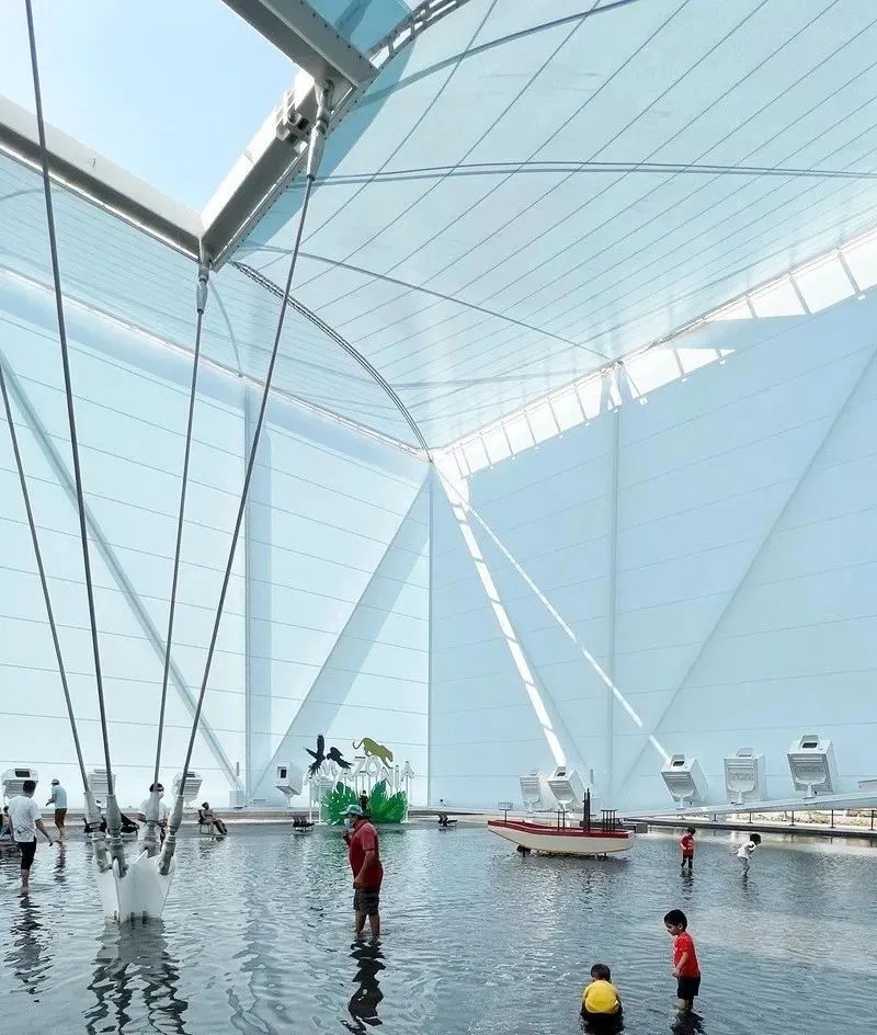 2020迪拜世博會機遇館,是本屆世博會三大主題之一,探索了我們如何“釋放個人和集體的潛能,并強調了每個人都有力量讓世界變得更美好”,而另外兩個主題分別是“可持續發展”和“流動性”。展館還包括一個漂浮在地面上空32米處的膜結構,象征著人們渴望實現的夢想。該結構是由織物覆蓋在金屬框架上所形成的,像云朵一樣,為廣場遮擋了陽光的直射。膜結構對透明度、光影和顏色的運用十分巧妙,它們會隨著一天之內的時間、日光和人們的運動而不斷變化。