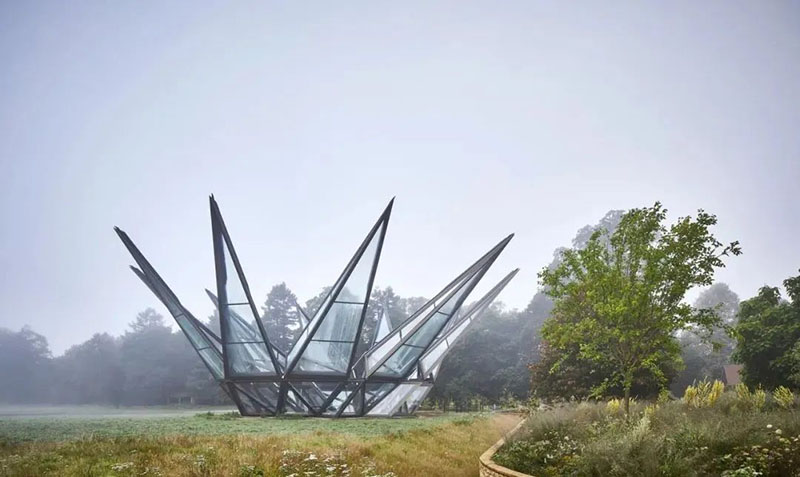 溫室結構高度為15米,占地面積143平方米,可展開的結構成為新花園的焦點,展現(xiàn)出古代絲綢之路對當今英國花園的影響,由十個玻璃和鋁結構的“萼片”組成,展開時間為四分鐘,形成了大型皇冠形空間。