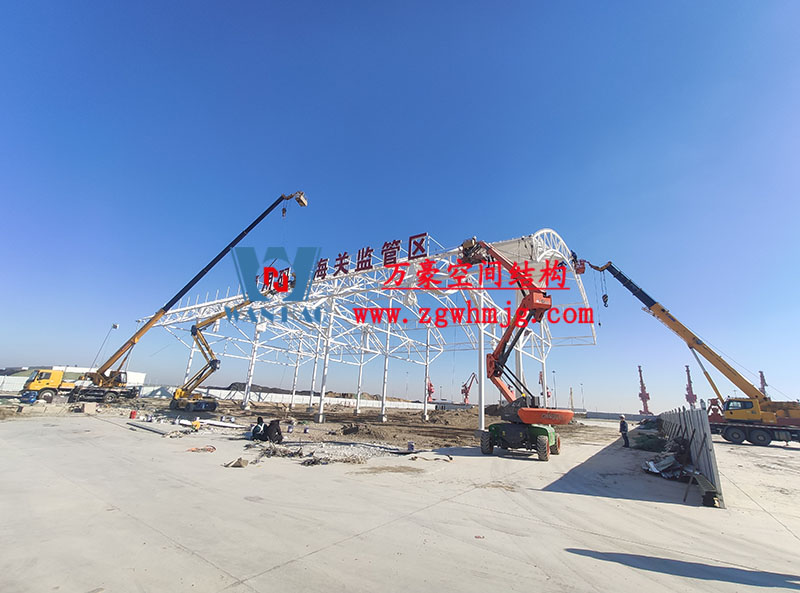 射陽港港區國家一類開放口岸一關兩檢查驗設施項目位于江蘇省鹽城市射陽縣臨港工業園區,用鋼量150噸,膜結構展開面積3000平米,由寧波萬豪空間結構工程有限公司承建。