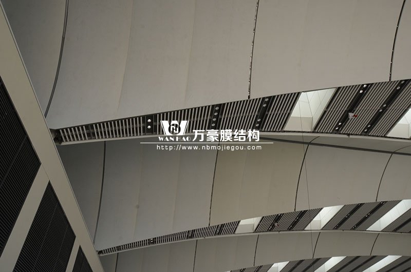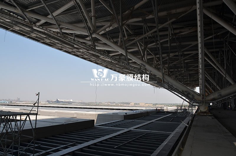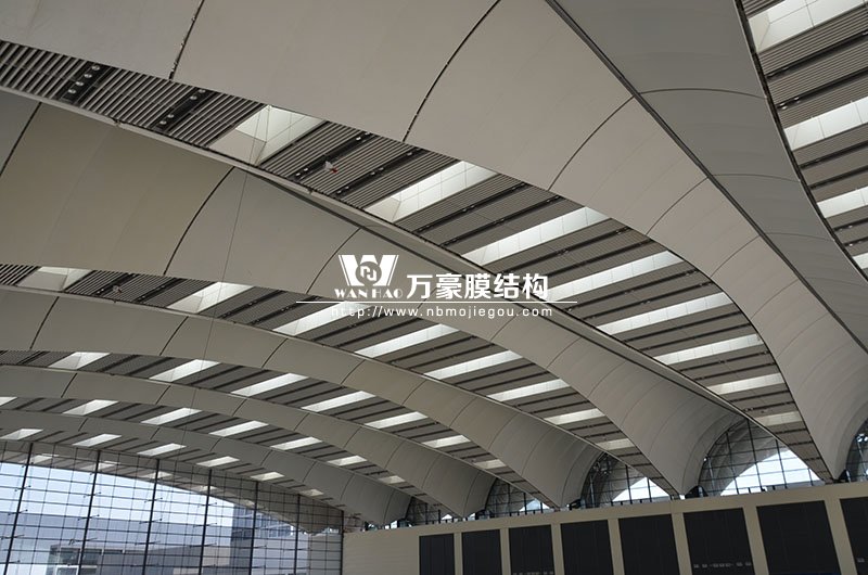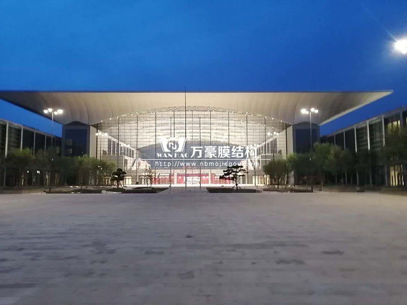 青島紅島國際會議中心幕墻膜結構工程,由寧波萬豪空間結構工程有限公司承建,現場測量、深化設計、制作及安裝由寧波萬豪全權負責。該工程用鋼量1000多噸,PTFE室內屋面膜結構展開面積17000多平方米,PTFE室外屋面膜結構展開面積20000多平方米。