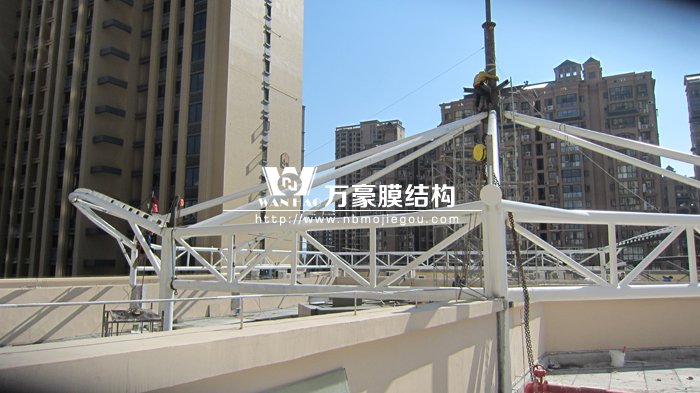 本工程總建筑面積約900平方米,主體一根主柱、九根支柱,四周單片桁架連接,總體一個帽柱,直線長為26.9米,帽柱總高33.6米,寬為27.8米。因為本工程坐落在商業區中心,四周都是五層商鋪,吊車無法進入施工現場,先用25噸吊車把材料送到五層樓房頂,后用人工或手拉葫蘆進行運送和安裝。施工范圍包括鋼結構系統與膜材系統的制作和現場安裝施工,現工程已經進行到鋼結構階段。