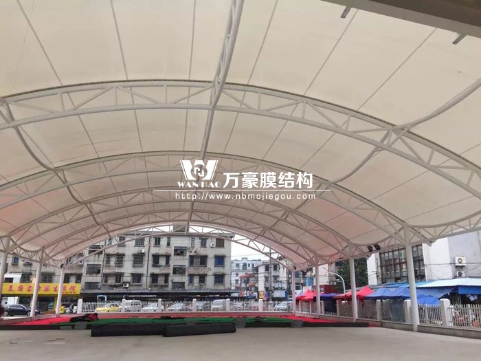 本工程位于寧波市鎮海區駱駝街道,業主單位為鎮海區駱駝街道辦事處,工程于3月17日正式完工驗收。因膜結構藝術性、自潔性、大跨度、經濟性、施工快等特點,越來越多的建筑使用了膜結構,本次工程公司設計部先設計好,然后在公司的工廠把鋼結構和膜材加工好,最后只需在工地進行安裝,所以膜結構的施工時間會比傳統工程要短。相信使用后一定會給當地居民帶來更便利的生活。