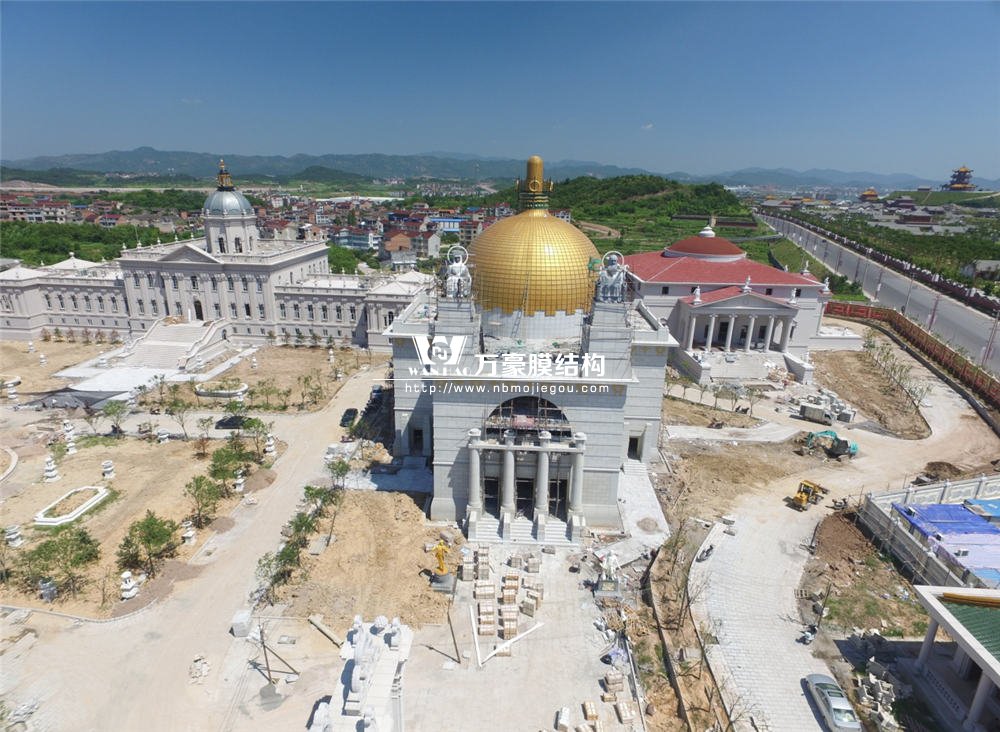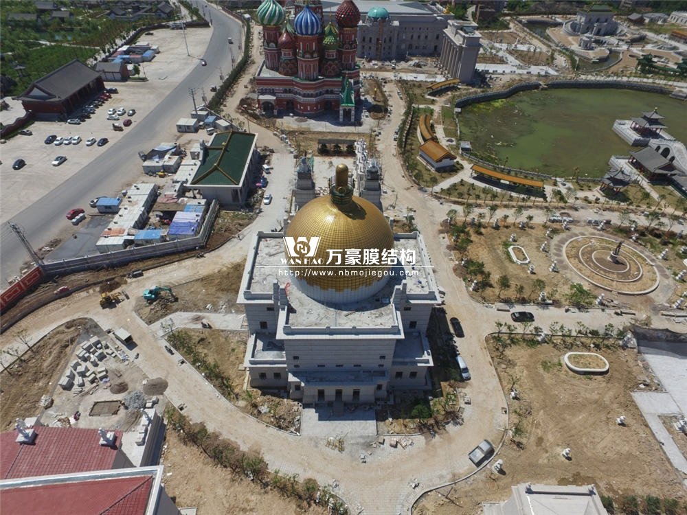 項(xiàng)目坐落于浙江省東陽(yáng)市橫店影視城圓明新園皇家園林內(nèi),奧地利館穹頂結(jié)構(gòu)呈現(xiàn)出一個(gè)鍍金大圓頂,完美重塑奧地利施坦霍夫教堂這個(gè)奧地利新藝術(shù)派令人驚嘆的建筑藝術(shù)杰作。