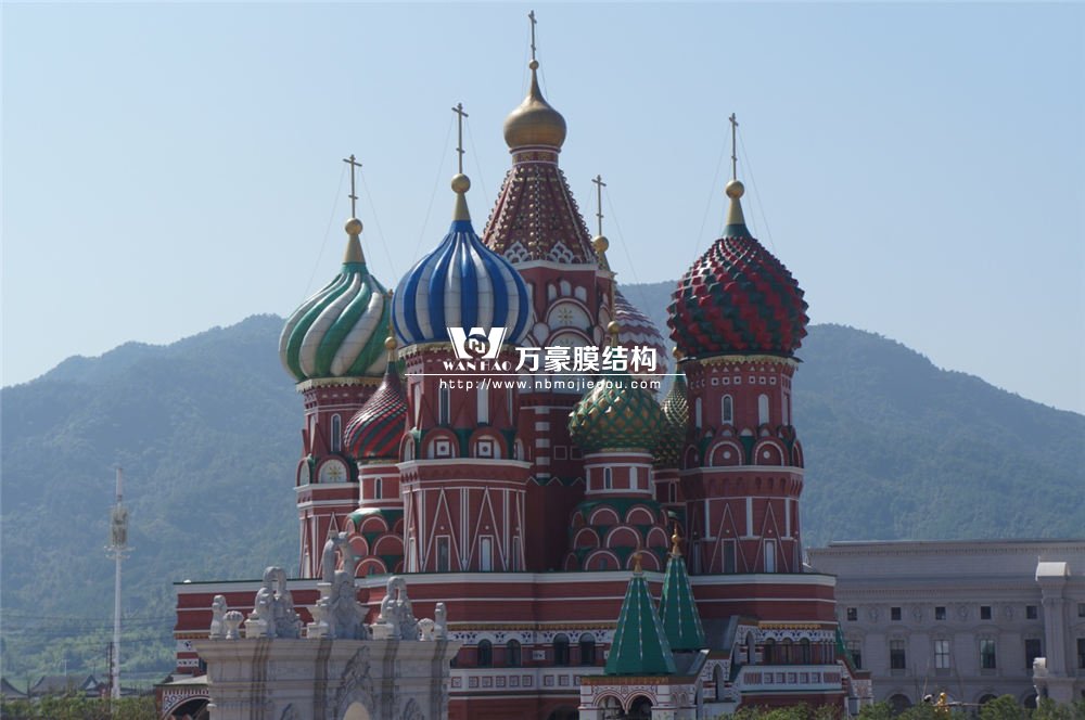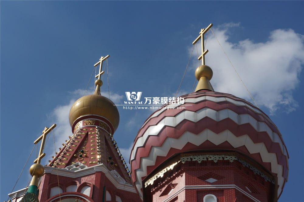 項目坐落于浙江省東陽市橫店影視城圓明新園皇家園林內,金色穹頂標高達61.2米,單個穹頂重量達17噸。穹頂結構充分利用鋼結構異形特性,完美重塑俄羅斯圣瓦西里大教堂的莊嚴宏偉,完美再現圓明園萬國建筑的雍容華貴。