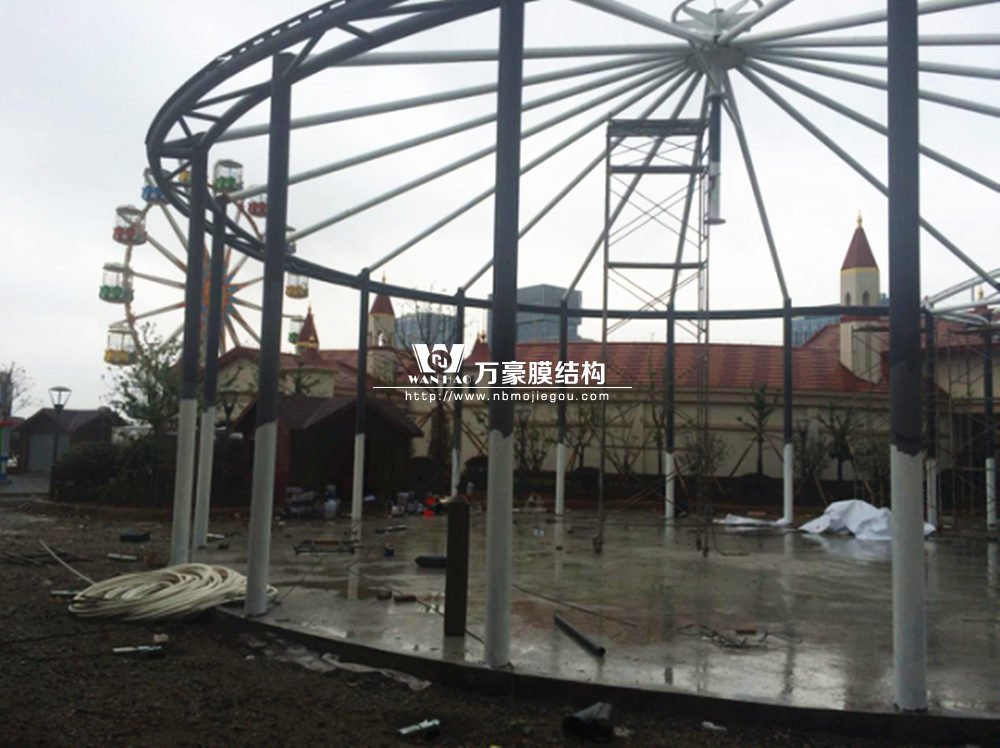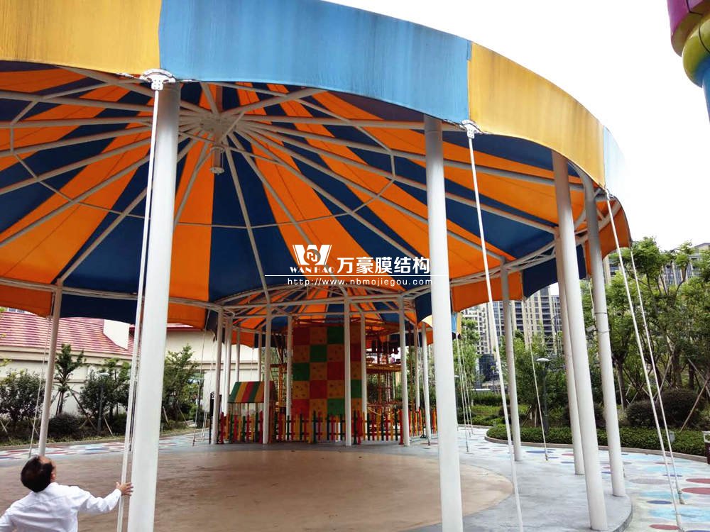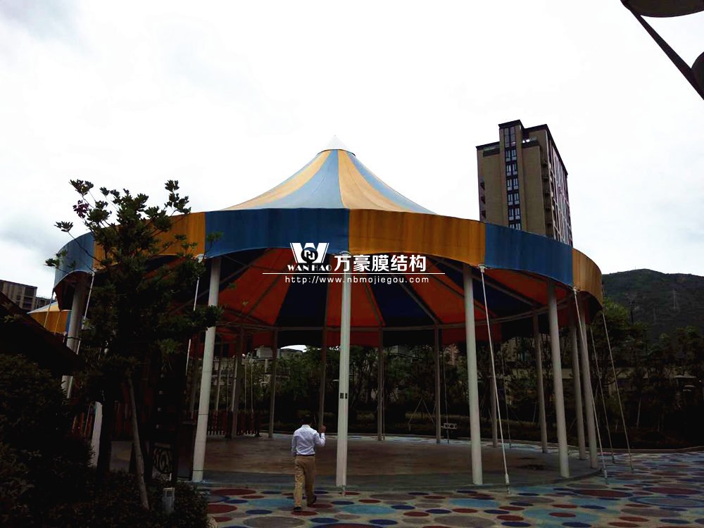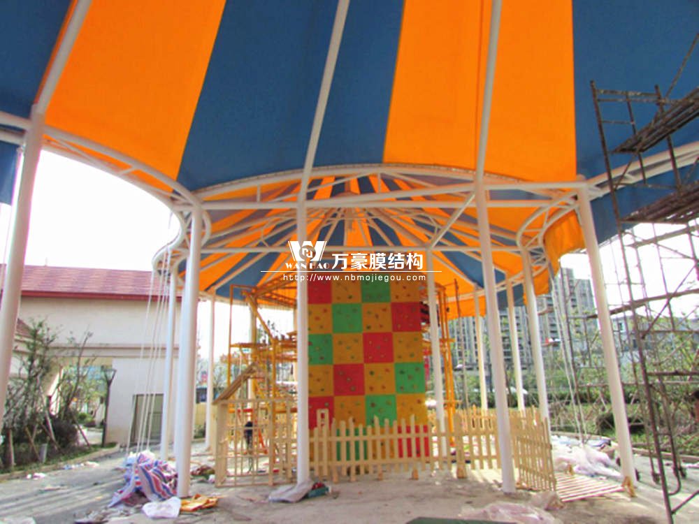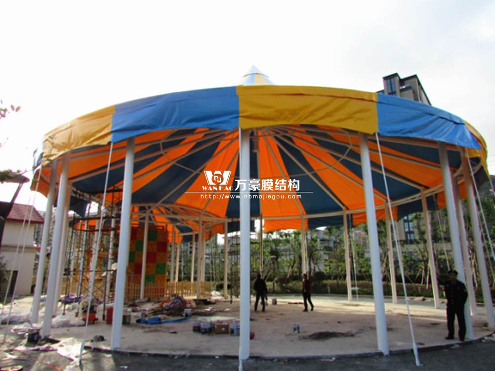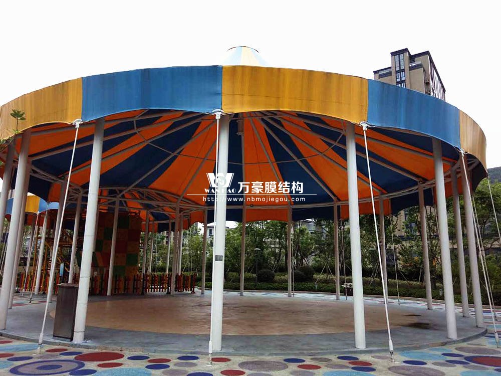 舟山東港兒童樂園膜結構工程坐落于舟山群島東南部的普陀區唯一一家大型兒童戶外游樂場所──東港兒童樂園之內。工程結構形式為張拉式,膜屋面投影面積為1458.53平方米??偯娣e為1648.19平方米,其中屋面展開面積為1527.13平方米,裙擺展開面積為121.06平方米。
