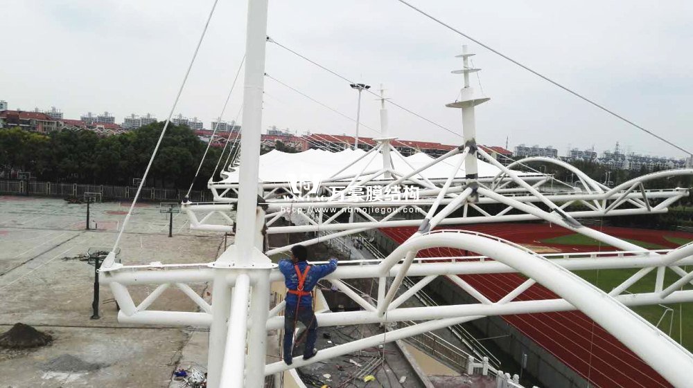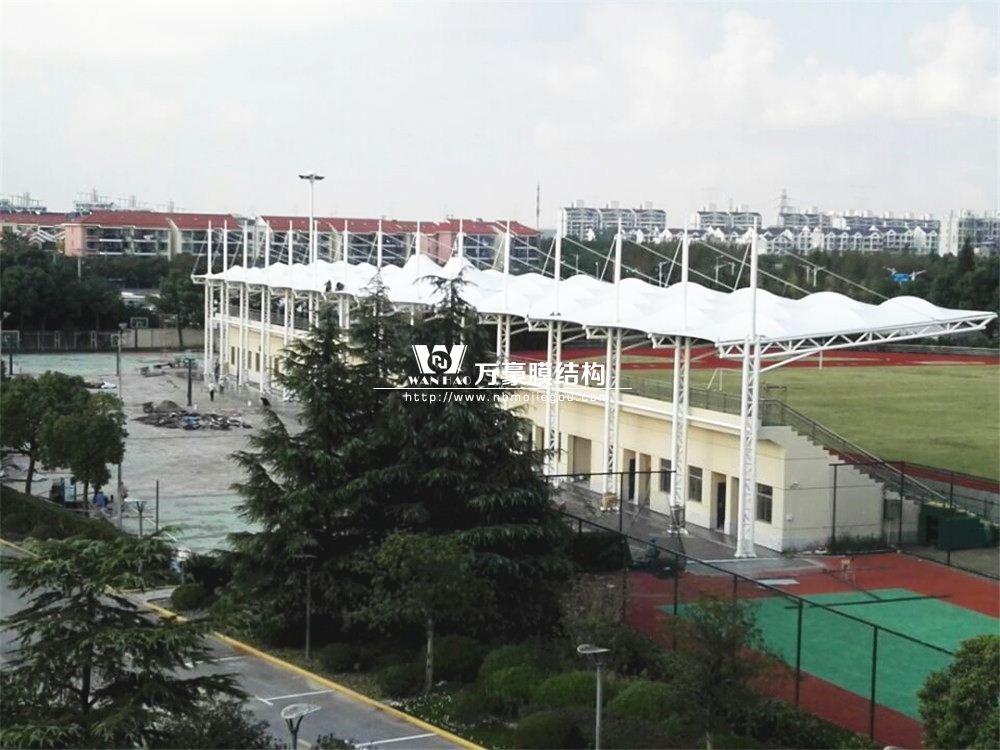 項目坐落在上海市青浦區公園東路1100號,上海市青浦高級中學運動場內。由15根雙立柱支撐,15榀桁架懸挑均勻受力及14塊跨度較大的意大利進口耐馳二氧化鈦NZ-1400-3膜材張拉而成。鋼構總重約100噸,膜面積約2100平。