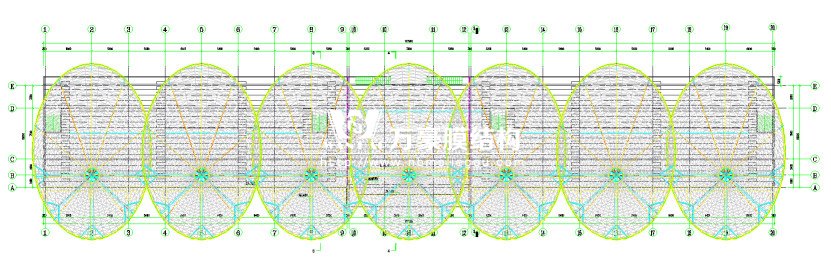 膜結構工程簡介:膜結構雨棚位于室外看臺A-E軸/1-20軸區域。膜結構雨棚采用張拉索膜結構,膜材采用進口法拉利1502t2膜材,雨棚柱頂標高32.643米,由7個長30.08米,寬17.38米的倒傘形狀的單體組成。