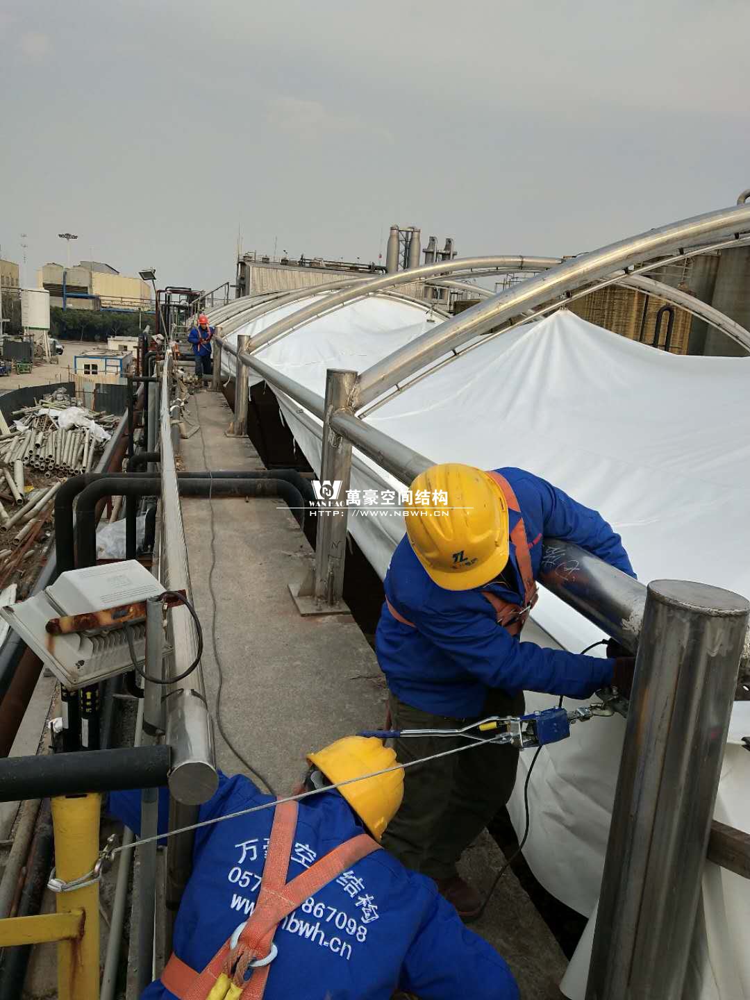 東廠區(qū)生化池加蓋工程,坐落于浙江省紹興市杭州灣上虞經(jīng)濟開發(fā)區(qū)龍盛科技園內(nèi)。整個項目由A/O池加蓋4座、二沉池加固定蓋4座、濃縮池加蓋2座、氧化池加蓋1座、氧化氣浮池加蓋1座、氧化集水池加蓋1座、出水調(diào)節(jié)池1座、安諾池1座,共計15座鋼膜結(jié)構(gòu)組成。總用鋼量達350噸,總建筑面積達35000平方米。