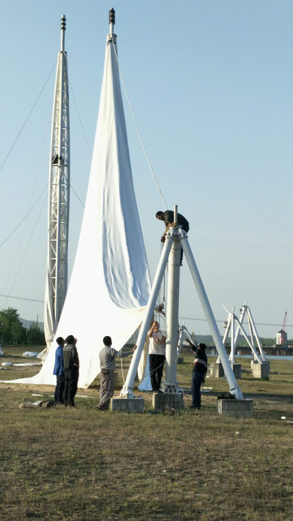 應對與高起點規劃、高標準建設的原則,寧波萬豪空間結構工程有限公司完美的完成了此次工程。本景觀膜結構安全等級為二級,膜材選用意大利進口雙面PVDF超自潔涂層膜材,鋼結構設計使用年限20年。總建筑面積約為860平方米,總用鋼量約為27.69噸。桁架、鋼管材質均為Q235B鋼,相貫焊接。所有鋼構件熱鍍鋅處理,運輸、安裝過程中對涂層的損傷,須視損傷程度的不同釆取相應的修補方式,對拼裝焊接的部位必須清除焊渣,進行表面處理達到St3級要求后,涂刷環氧無機富鋅底漆+環氧云鐵中間漆+氟碳面漆。
