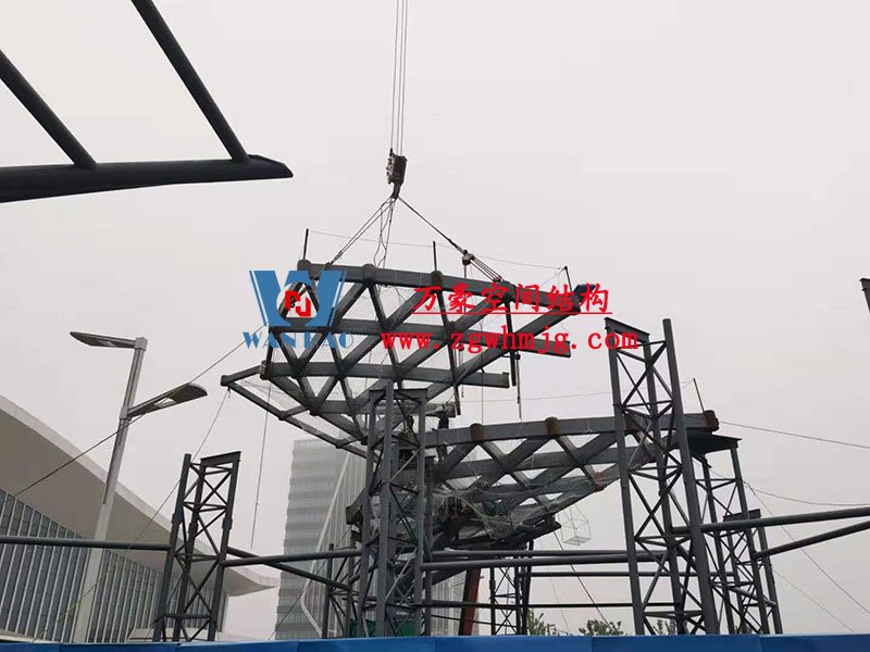 本工程鋼結構為單層雙曲網殼結構體系,平面上為對稱結構,大翅膀長跨約 50m,短跨約 25m,小翅膀長跨約 35m,短跨方向約 15m。建筑頂面為雙曲造型,建筑物最高點標高約17米。總用鋼量800噸,膜體總面積約7000平方米。
