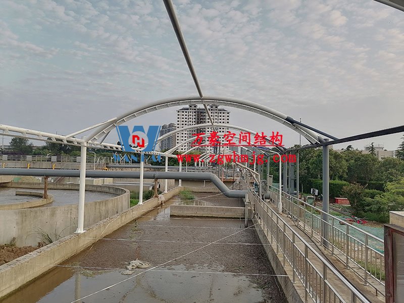 項目采用鋼骨架反吊膜結構,工程內容由混泥土基礎工程、鋼結構工程、反吊膜屋面工程三部分組成,膜結構展開面積12000平米。