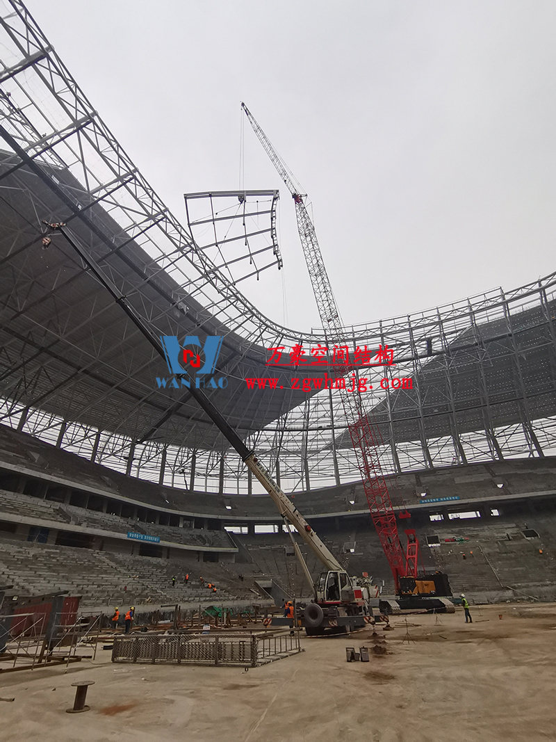 您所在的位置: 首頁>>新聞動(dòng)態(tài)>>萬豪資訊重慶龍興足球場(chǎng)ETFE屋面膜結(jié)構(gòu)工程屋面鋼結(jié)構(gòu)完成,膜結(jié)構(gòu)安裝中