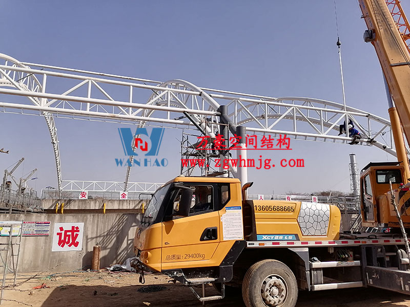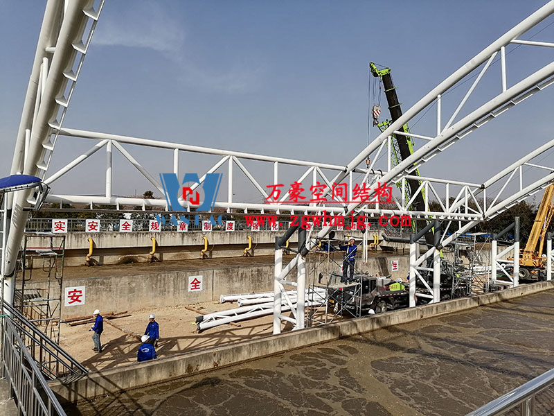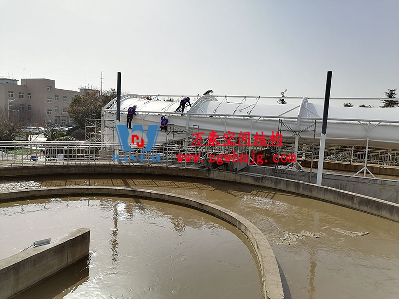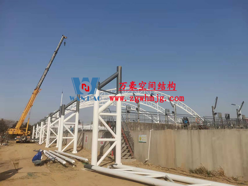 目前,進水口、粗格柵、細格柵、厭氧池兩個池子鋼結構都已完成 ,厭氧池立面膜已張拉,開始裝側面膜,南區氧化溝三個主桁架完成 ,準備進行下一步施工。