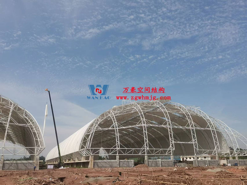 項目總承包單位中國五冶,專業分包單位寧波萬豪空間結構,儲煤大棚設計選用了大跨度空間結構設計,跨度110米,長度310米,高度45米中間無柱子,屋面選用了二種不同透光率的建筑膜材料,白天內部通透明亮,空間無死角使用,歷時近半年已建設完成,即將投入使用。