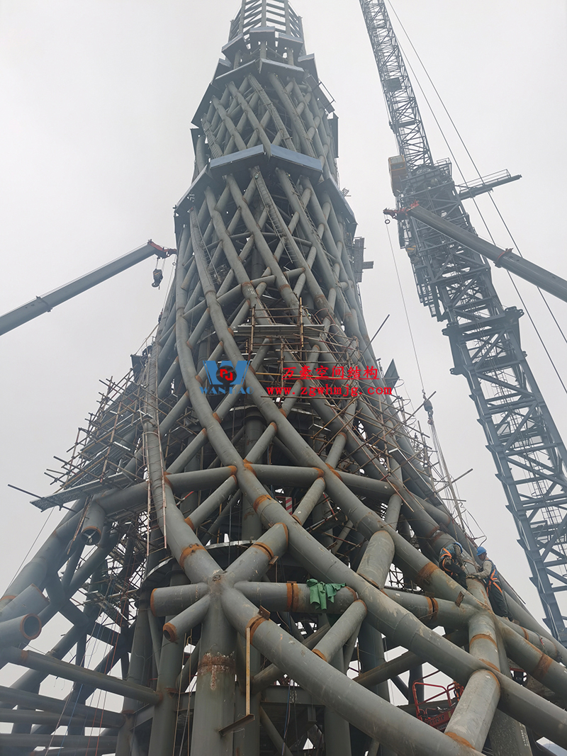 塔身為筒中筒鋼結構,內筒為等間距布置的10根豎柱和水平梁組成,外筒為雙向螺旋交織的菱形網格曲線空間鋼結構,形似廣州小蠻腰,呈現“纖纖細腰,不盈一握”的驚人審美效果,也與中國傳統審美觀相契合。