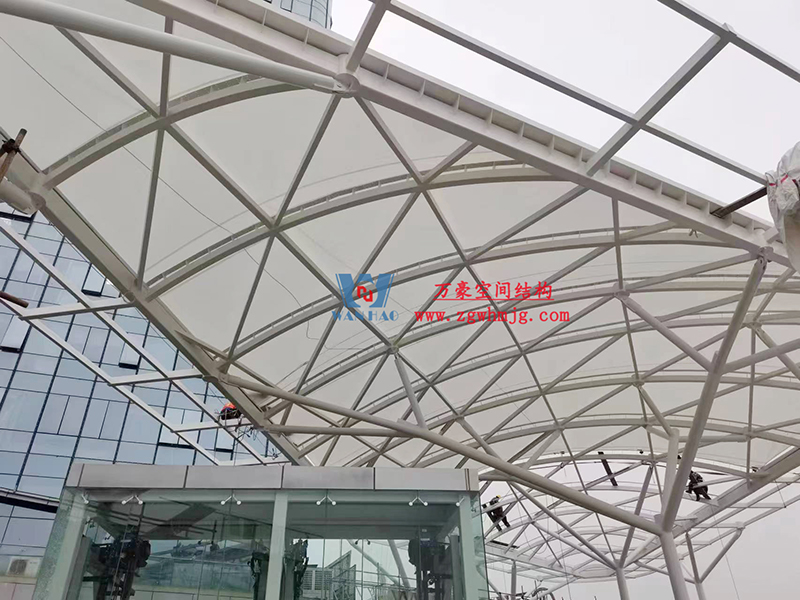 南充萬達項目鋼膜結構ETFE蓋頂天幕工程,該項目總用鋼量500噸,其中主體鋼結構400噸,二次鋼結構100噸,膜材展開面積總計13500平米,其中ETFE膜(俗稱“軟玻璃”)7000平米,二氧化鈦高自潔涂層PVDF膜6500平米。本項目作為四川省南充市萬達廣場新地標商業綜合體配套設施,建成后將成為南充市又一經典之作。