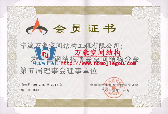 我司(寧波萬豪空間結(jié)構(gòu)工程有限公司)在本次會議上榮獲“中國鋼結(jié)構(gòu)協(xié)會空間結(jié)構(gòu)分會理事單位”。